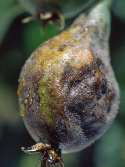 Fruit mommifié de poire Williams du au feu bactérien, gouttelettes d'exsudat