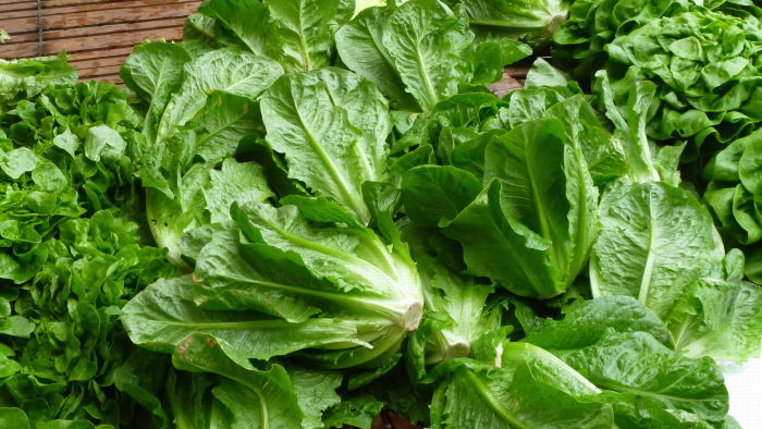 Banc de marché : laitue romaine. Bergerac, printemps 2016