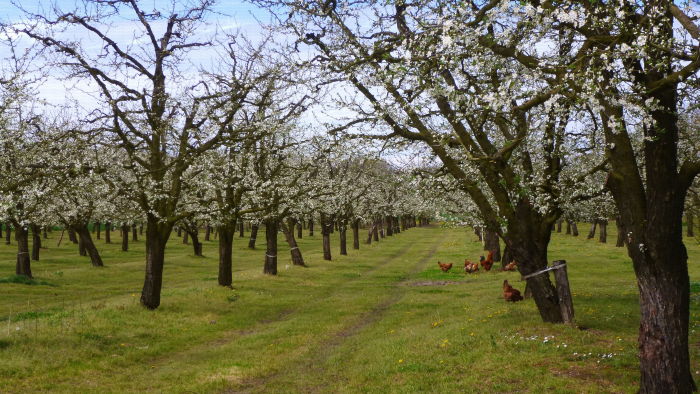 Vergers de prune d'Ente en Dordogne, floraison printemps 2016 - Avec coq et poules