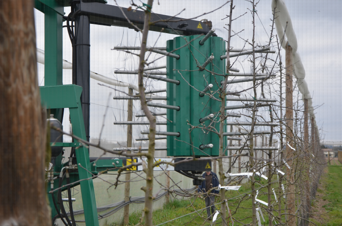 Eclaircissage mécanique sur bourgeons de pommier avec Eclairfel (détail). Verger conduit en axe