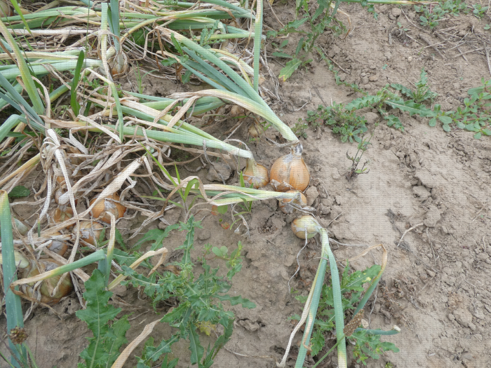 Rangs d'oignons, juste avant la récolte. CTIFL centre de Lanxade (24)