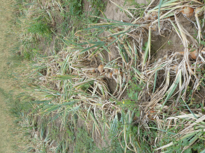 Rangs d'oignons, juste avant la récolte. CTIFL centre de Lanxade (24)