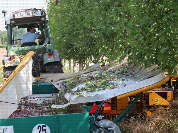 Prune d'Ente - Chantier de récolte mécanique sur le verger expérimental conduit en mur fruitier, CTIFL, centre de Lanxade (24)