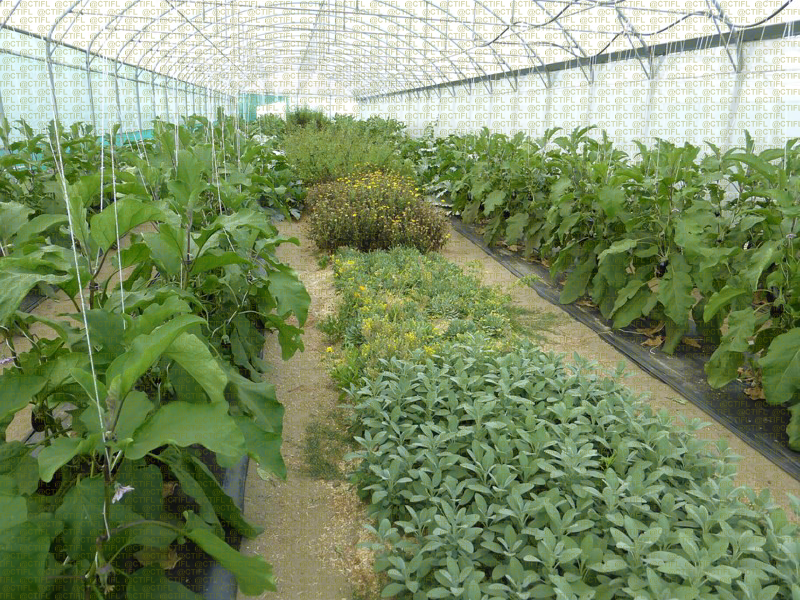 Culture d'aubergine sous abri froid aménagée avec des plantes nectarifères, pollinifères et banque dans le but d'attirer les ennemis naturels de pucerons et d'amplifier leurs populations.
